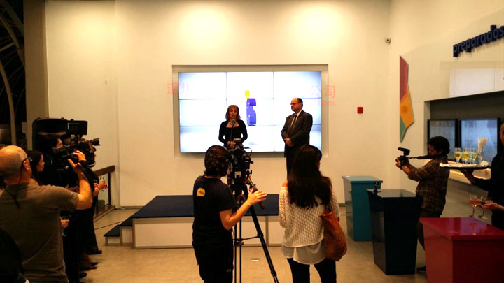 項目介紹:產品采用優色液晶拼接大屏,2X2壁掛是安裝,5.3mm超窄邊拼縫。