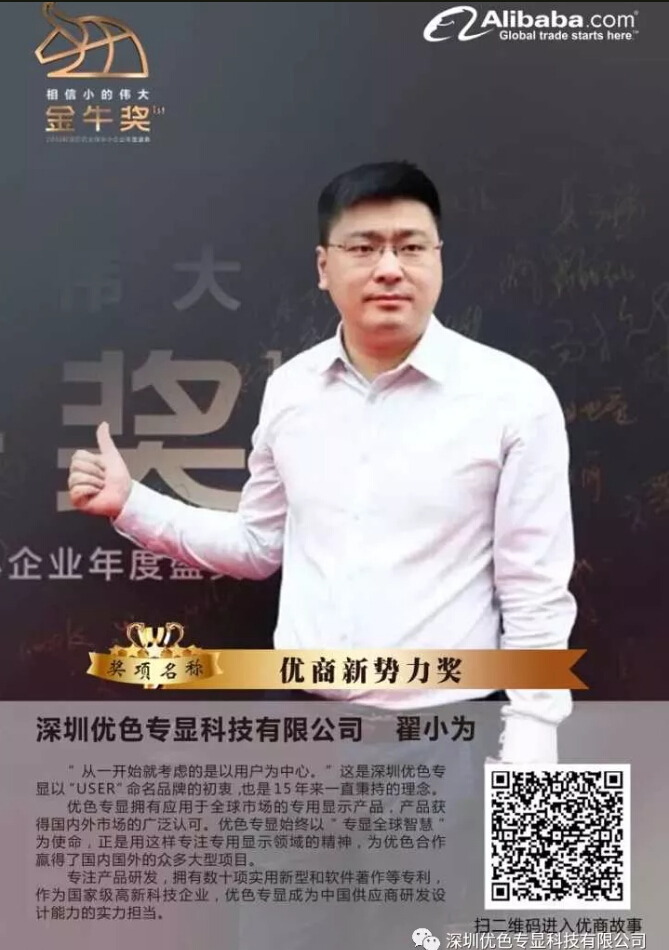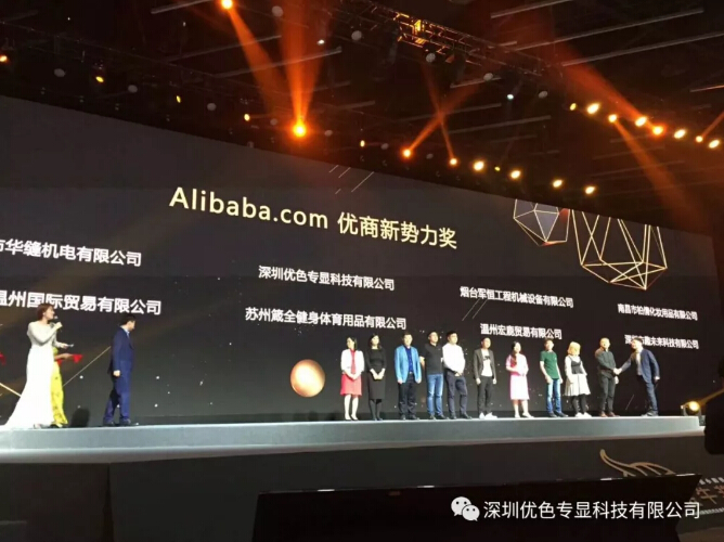 深圳優色專顯科技有限公司,于2018年4月2日阿里巴巴總部杭州舉行的全球供應商評選中,以優秀的產品品質及良好的終端客戶口碑榮獲 “優商新勢力獎” ,為優色專顯 "追求卓越品質、保持領先技術,真誠服務客戶"的公司理念再添一筆精彩的注腳。