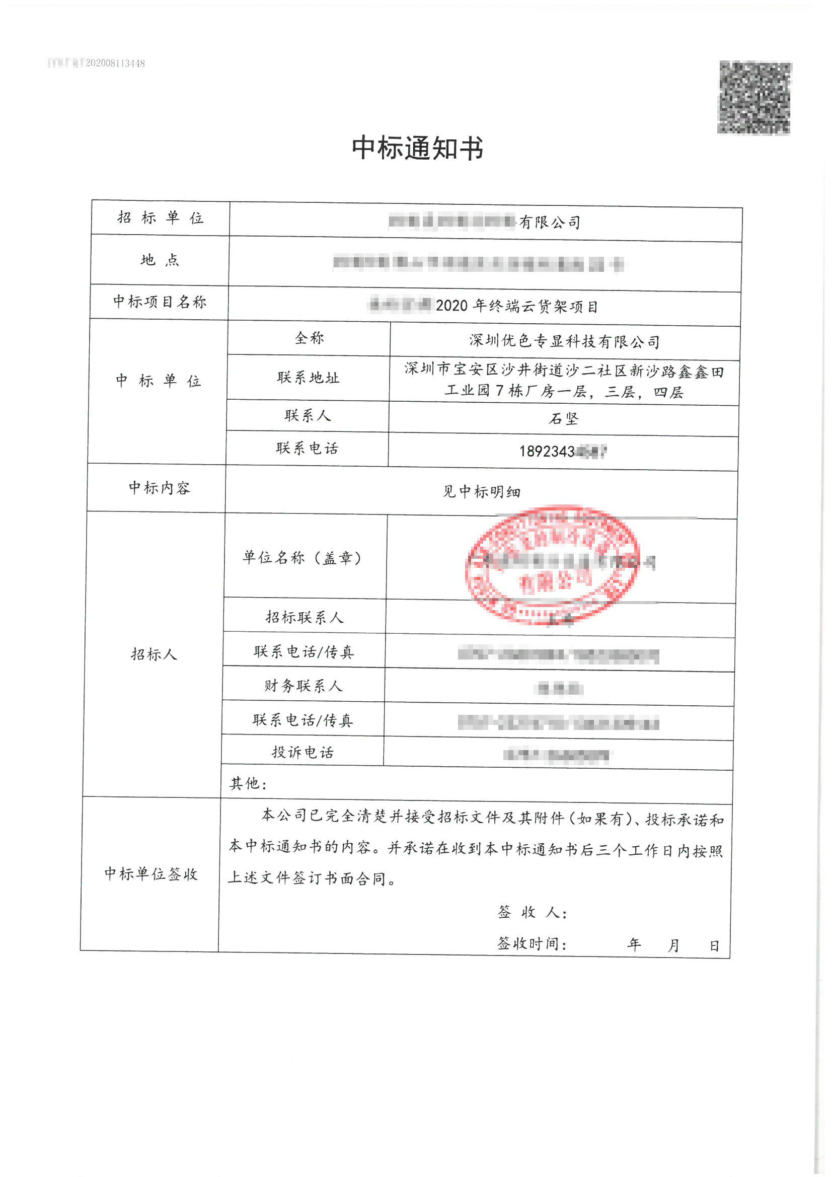 熱烈祝賀我司競標世界500強上市企業“2020年終端云貨架項目”于2020年8月21日順利中標。