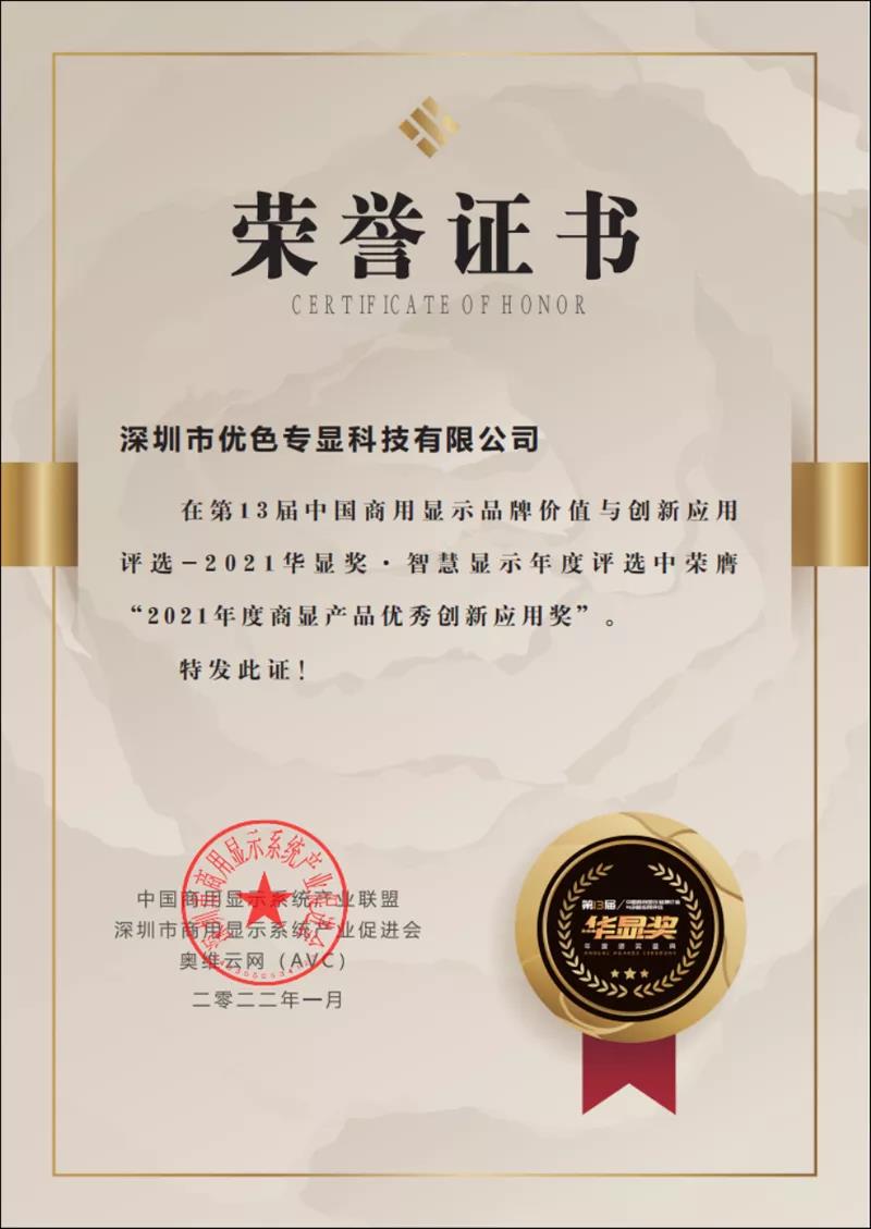 熱烈祝賀優色專顯榮獲“2021年度商顯產品優秀創新應用獎”-華顯獎