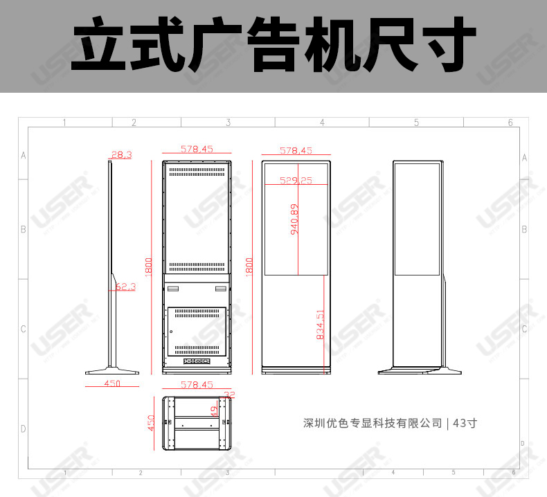 菜單產品中心Product center 液晶廣告機 壁掛式廣告機 落地立式廣告機 電梯超薄廣告機 車載廣告機 高亮廣告機 戶外廣告機 液晶拼接屏 專業液晶拼接屏 4K液晶拼接屏 廣告拼接屏 無縫液晶拼接屏 觸摸液晶拼接屏 LED顯示屏 觸控一體機 壁掛式觸控一體機 立式觸控一體機 斜面觸控一體機 智能家居觸控一體機 戶外觸控一體機 液晶電子白板 教育電子白板 會議電子白板 工控一體機 觸摸顯示器 紅外觸摸顯示器 電容觸摸顯示器 電阻觸摸顯示器 聲波觸摸顯示器 納米觸摸顯示器 液晶監視器 專業級監視器 4K監視器 嵌入式監視器 機架式監視器 開放式監視器 SDI監視器 高亮監視器 廣播級監視器 工業顯示器 4K顯示器 機架式顯示器 開放式顯示器 醫療顯示器 KVM顯示器 指揮室顯示器 智慧校園產品 專業定制商顯 多屏廣告機 多功能觸控一體機 多功能廣告機 微信打印廣告機 魔鏡廣告機 透明廣告機 全息廣告機 條形屏廣告機 旋轉廣告機 裸眼3D廣告機 人工智能產品 顯示配套設備 拼接配套設備 廣告機播放盒 OPS播放盒 拼接支架 移動支架 相關軟件 吊頂支架 線材 木架 蜂窩箱 桌面底座 熱門產品 →優色3.5mm超窄邊46寸液晶拼接屏→優色49寸3.5mm超窄邊液晶拼接屏→優色3.5mm超窄邊55寸液晶拼接屏 您的位置:首頁 → 公司產品 → 液晶廣告機 → 落地立式廣告機 43寸立式落地廣告機類別:落地立式廣告機 簡介:產品概述: ?高清:采用高清16:9全視角LCD顯示屏,分辨率為1920*1080 ?超?。汗I級外觀,設計合理,穩固結實,最薄處28.3mm ?工藝:鋁合金氧化拉絲邊框,機身采用金屬噴涂的五金冷軋鋼板,... 在線咨詢 返回列表 產品說明 相關產品 65寸落地立式廣告機 55寸立式廣告機 50寸立式落地廣告機 43寸立式落地廣告機 43寸46寸49寸55寸65寸86寸仿蘋果款立式廣告機 55寸超薄立式廣告機