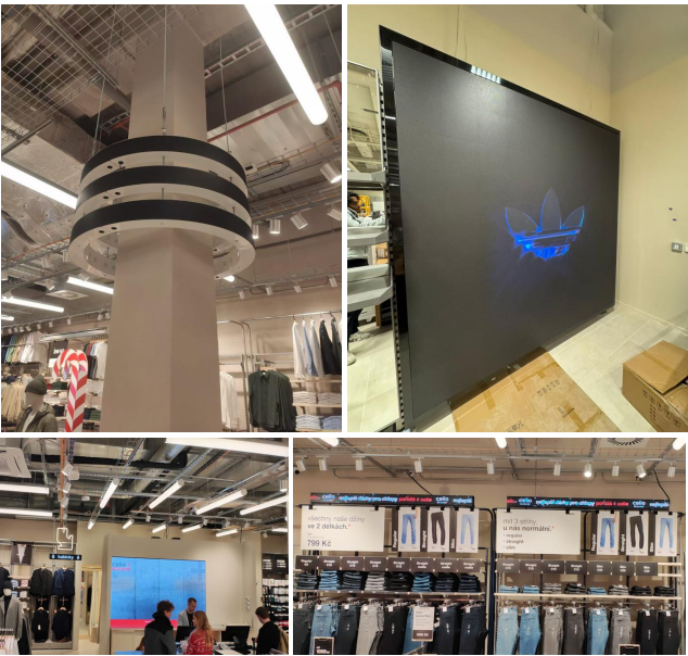 服裝連鎖門店LED大屏、吊裝圓環(huán)LED屏、條型LED顯示屏、貨架屏