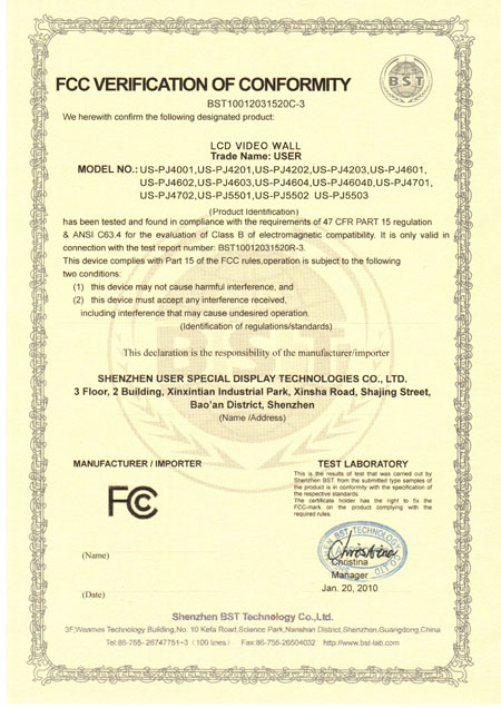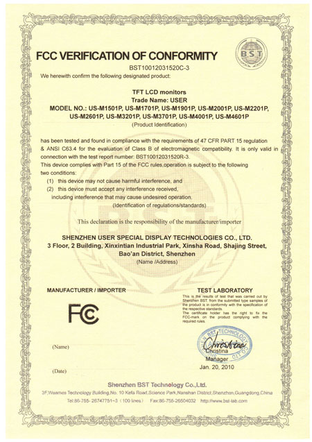 FCC認證歐盟認證(液晶監視器合格證明證書)